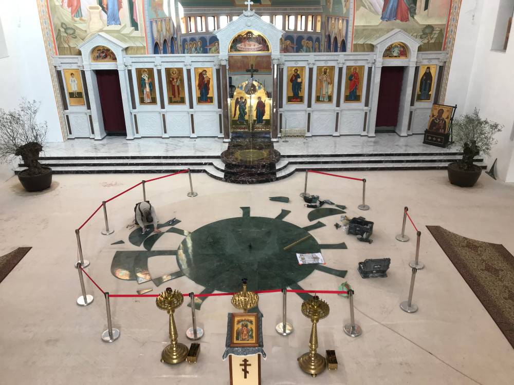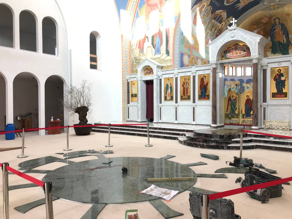 Στην παρούσα φάση τοποθετείται το δάπεδο στο κεντρικό τμήμα του ναού και εγκαθίσταται το ηχοσύστημα ενώ συνεχίζονται οι παρεμβάσεις στον εσωτερικό και εξωτερικό χώρο.