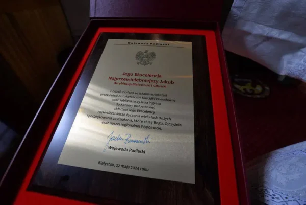Στο τέλος, ο Μακαριώτατος σε αναγνώριση του ποιμαντικού έργου του Αρχιεπισκόπου Μπιαλίστοκ και Γκδάνσκ κ. Ιακώβου, απένειμε στον Σεβασμιώτατο το παράσημο της Ισαπόστολο και Αγίας Μαρίας της Μαγδαληνής.