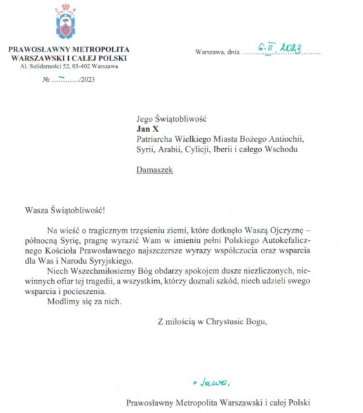 Ο Μητροπολίτης Βαρσοβίας και πάσης Πολωνίας κ.κ. Σάββας έστειλε το συλλυπητήριο μήνυμά για τον σεισμό στη νοτιοανατολική Τουρκία και τη βόρεια Συρία. Ο Μακαριώτατος εξέφρασε την αλληλεγγύη του και την συμπαράστασή του στον Οικουμενικό Πατριάρχη κ.κ. Βαρθολομαίο και στον Πατριάρχη Αντιοχείας κ.κ. Ιωάννη.