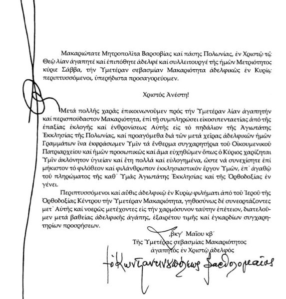 Μετά πολλῆς χαρᾶς ἐπικοινωνοῦμεν πρός τήν Ὑμετέραν λίαν ἀγαπητήν καί περισπούδαστον Μακαριότητα, ἐπί τῇ συμπληρώσει είκοσιπενταετίας ἀπό τῆς ἐπαξίας ἐκλογῆς καί ἐνθρονίσεως Αὐτῆς εἰς τό πηδάλιον τῆς Ἁγιωτάτης Εκκλησίας τῆς Πολωνίας, καί προαγόμεθα διά τῶν μετά χεῖρας ἀδελφικῶν ἡμῶν Γραμμάτων ἵνα ἐκφράσωμεν Ὑμῖν τά ἔνθερμα συγχαρητήρια τοῦ Οἰκουμενικοῦ