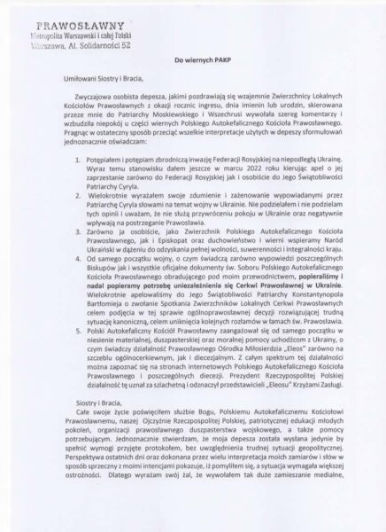 “Τόσο εγώ προσωπικά, ως Προκαθήμενος της Πολωνικής Αυτοκέφαλης Ορθόδοξης Εκκλησίας, όσο και οι Επίσκοποι, ο κλήρος και οι πιστοί, υποστηρίζω το Ουκρανικό Έθνος στην επιδίωξή του να ανακτήσει την πλήρη ελευθερία, κυριαρχία και ακεραιότητα της χώρας”, ξεκαθαρίζει και προσθέτει ότι από την αρχή κιόλας του πολέμου, όπως μαρτυρούν οι δηλώσεις Επισκόπων και όλα τα επίσημα έγγραφα κατά τη διάρκεια της συνεδρίασης της Ιεράς Συνόδου της Πολωνικής Αυτοκέφαλης Ορθόδοξης Εκκλησίας που συνεδρίασε υπό την προεδρία του, “υποστηρίξαμε και συνεχίζουμε να υποστηρίζουμε την ανάγκη να γίνει ανεξάρτητη η Ορθόδοξη Εκκλησία στην Ουκρανία. Έχουμε επανειλημμένα απευθύνει έκκληση στον Παναγιώτατο Πατριάρχη Κωνσταντινουπόλεως Βαρθολομαίο να συγκαλέσει Πανορθόδοξη Σύνοδο προκειμένου να ληφθεί μια κοινή Ορθόδοξη απόφαση επί του θέματος, να λυθεί η δύσκολη κανονική κατάσταση, ώστε να αποφευχθούν περαιτέρω διαχωρισμοί στην Ορθοδοξία”.