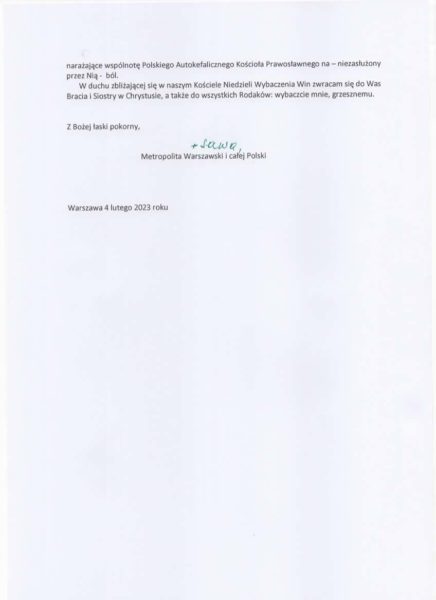 “Η ερμηνεία των προθέσεων μου και των λεγομένων μου με τρόπο αντίθετο με τις προθέσεις που είχα δείχνουν ότι έκανα λάθος και η κατάσταση απαιτούσε περισσότερη προσοχή. Γι’ αυτό εκφράζω τη λύπη μου που προκάλεσα τόσο μεγάλη φασαρία στα μέσα ενημέρωσης, εκθέτοντας την κοινότητα της Πολωνικής Αυτοκέφαλης Ορθόδοξης Εκκλησίας. Στο πνεύμα της Κυριακής της Συγχώρεσης των Αμαρτιών, που πλησιάζει στην Εκκλησία μας, απευθύνομαι σε εσάς, εν Χριστώ αδελφοί και αδελφές, και σε όλους τους συμπατριώτες μου: συγχωρέστε με, τον αμαρτωλό”, καταλήγει.