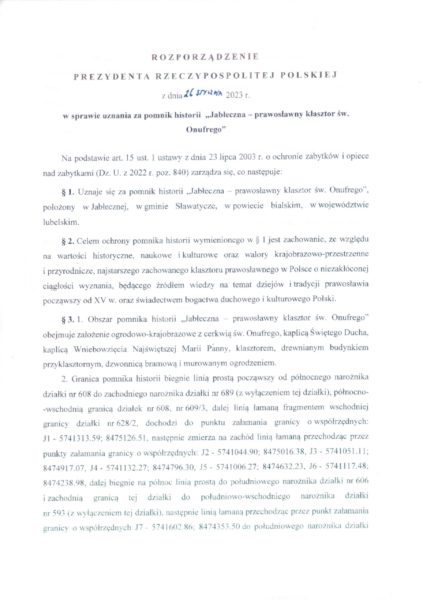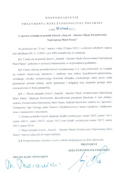 Παρουσία του Προέδρου, Αντρέι Ντούντα, υπεγράφη στο Προεδρικό Μέγαρο της Πολωνίας η επίσημη ένταξη των Ιερών Μονών του Αγίου Ονουφρίου και του Ευαγγελισμού της Υπεραγίας Θεοτόκου στον κατάλογο των “Μνημείων της Ιστορίας”. Πρόκειται για τον υψηλότερο θεσμό στην Πολωνία που έχει ως βασική αποστολή του στην ανάδειξη των πολιτιστικών αξιών μέσα από μνημεία, παραδόσεις και έθιμα.