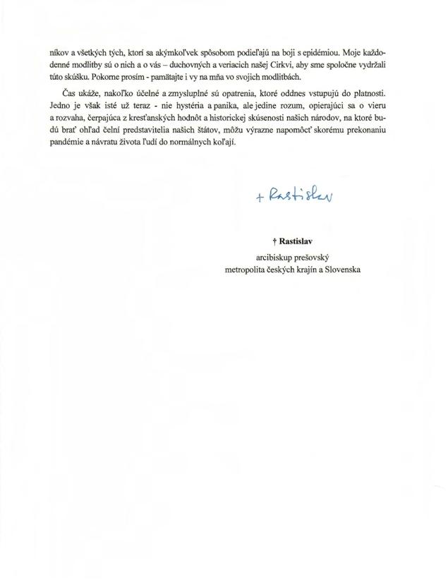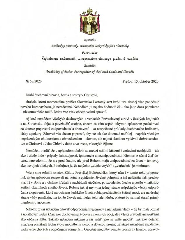 Κάλεσμα για συνεχή προσευχή στον Θεό ζητώντας το πρόωρο τέλος της πανδημίας, την θεραπεία των ασθενών και την ανάπαυση των νεκρών, απευθύνει, μεταξύ άλλων, προς κληρικούς και πιστούς μέσω Ποιμαντορικής Εγκυκλίου ο Μακαριώτατος Αρχιεπίσκοπος Πρέσοβ και πάσης Τσεχίας και Σλοβακίας κ.κ. Ραστισλάβ.