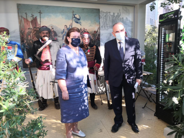 Η Υπουργός Πολιτισμού και Αθλητισμού Λίνα Μενδώνη και ο πρόεδρος της Εταιρείας για τον Ελληνισμό και τον Φιλελληνισμό και του Μουσείου Φιλελληνισμού, Κωνσταντίνος Βελέντζας