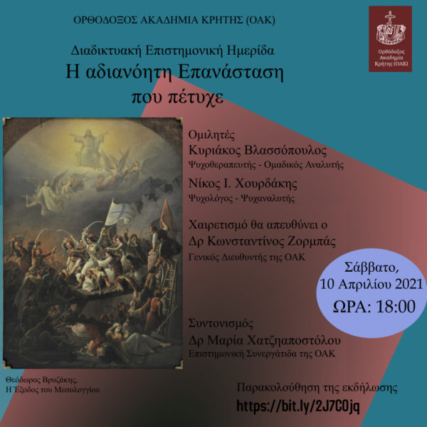 Η Ορθόδοξος Ακαδημία Κρήτης διοργανώνει το Σάββατο 10 Απριλίου 2021 και ώρα 18:00 επιστημονική διαδικτυακή εκδήλωση με θέμα: «Η Αδιανόητη Επανάσταση που πέτυχε».
