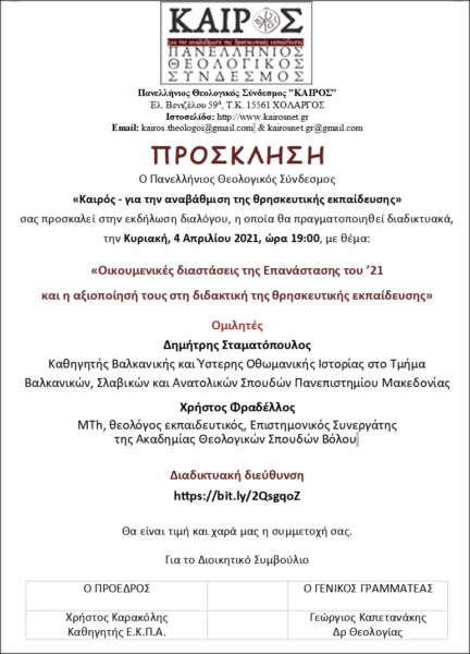 Με αφορμή τη συμπλήρωση 200 χρόνων από την Επανάσταση του 1821, ο Πανελλήνιος Θεολογικός Σύνδεσμος «Καιρός – για την αναβάθμιση της θρησκευτικής εκπαίδευσης» προγραμματίζει διαδικτυακή εκδήλωση, με θέμα «Οικουμενικές διαστάσεις της Επανάστασης του ’21 και η αξιοποίησή τους στη διδακτική της θρησκευτικής εκπαίδευσης».