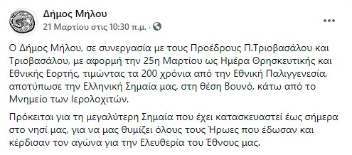 Δείτε τη σχετική ανάρτηση από τον Δήμο Μήλου: