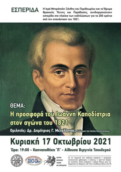 Eσπερίδα με θέμα «Η προσφορά του Ιωάννη Καποδίστρια στον αγώνα του 1821» συνδιοργανώνουν την Κυριακή το απόγευμα και ώρα 19:00 η Ιερά Μητρόπολη Ξάνθης και Περιθεωρίου και το Ίδρυμα Θρακικής Τέχνης και Παράδοσης στo πλαίσιo των εκδηλώσεων για τα 200 χρόνια από την επανάσταση του 1821.