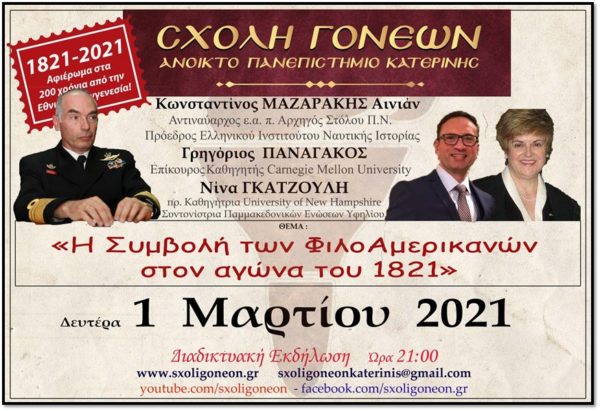 Με την εκδήλωση “Η Συμβολή των ΦιλοΑμερικανών στον Αγώνα του 1821” η Σχολή Γονέων – Ανοικτό Πανεπιστήμιο Κατερίνης συνεχίζει το αφιέρωμα των 11 εκδηλώσεων για τα 200 χρόνια από την Εθνική Παλιγγενεσία επιχειρώντας να “φωτίσει” από την πλευρά της Αμερικής την προσφορά των φιλοΑμερικανών στον Εθνικό Αγώνα για την απελευθέρωση της πατρίδας μας από τον Οθωμανικό ζυγό.