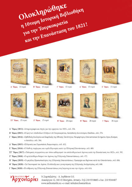 Μόλις κυκλοφόρησαν οι δύο τελευταίοι τόμοι της 10τομης «Ιστορικής Βιβλιοθήκης για την Τουρκοκρατία και την Επανάσταση του 1821» από τις εκδόσεις «Αρχονταρίκι». Όλοι οι τόμοι περιλαμβάνουν τα Πρακτικά των δέκα Συνεδρίων, που οργάνωσε η Εκκλησία της Ελλάδος με αφορμή την είσοδό μας στο επετειακό έτος 2021 και την έναρξη των εορτασμών για τα 200 χρόνια από την Επανάσταση του 1821. Τα Συνέδρια πραγματοποιήθηκαν με την επιμέλεια της Ειδικής Συνοδικής Επιτροπής Πολιτιστικής Ταυτότητας, ενώ οι δύο τελευταίοι τόμοι περιλαμβάνουν τα πρακτικά του 9ου και 10ου Συνεδρίου, που οργάνωσε η Εκκλησία της Ελλάδος.
