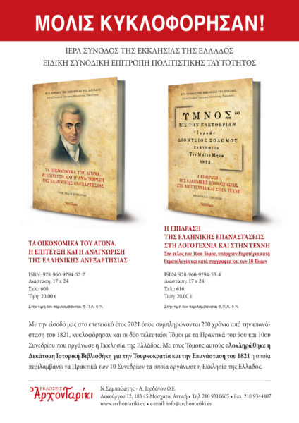 Μόλις κυκλοφόρησαν οι δύο τελευταίοι τόμοι της 10τομης «Ιστορικής Βιβλιοθήκης για την Τουρκοκρατία και την Επανάσταση του 1821» από τις εκδόσεις «Αρχονταρίκι». Όλοι οι τόμοι περιλαμβάνουν τα Πρακτικά των δέκα Συνεδρίων, που οργάνωσε η Εκκλησία της Ελλάδος με αφορμή την είσοδό μας στο επετειακό έτος 2021 και την έναρξη των εορτασμών για τα 200 χρόνια από την Επανάσταση του 1821. Τα Συνέδρια πραγματοποιήθηκαν με την επιμέλεια της Ειδικής Συνοδικής Επιτροπής Πολιτιστικής Ταυτότητας, ενώ οι δύο τελευταίοι τόμοι περιλαμβάνουν τα πρακτικά του 9ου και 10ου Συνεδρίου, που οργάνωσε η Εκκλησία της Ελλάδος.