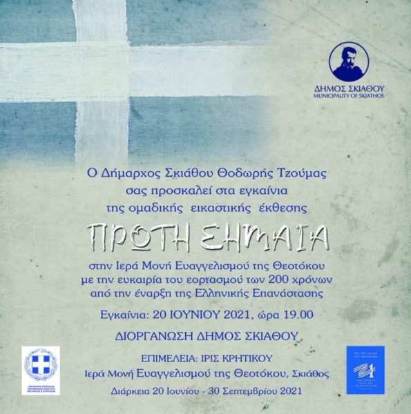Έχοντας υπ’ όψιν αυτό το γεγονός και με αφορμή τα 200 χρόνια από την έναρξη της Ελληνικής Επανάστασης, φέτος -και συγκεκριμένα από τις 20 Ιουνίου και μετά- στην Ιερά Μονή Ευαγγελισμού της Θεοτόκου στη Σκιάθο θα φιλοξενηθεί μια ομαδική εικαστική έκθεση, με αντικείμενο την ελληνική σημαία. Η έκθεση πραγματοποιείται με την επιμέλεια της Ίριδας Κρητικού και εγκαινιάζεται την Κυριακή 20 Ιουνίου.