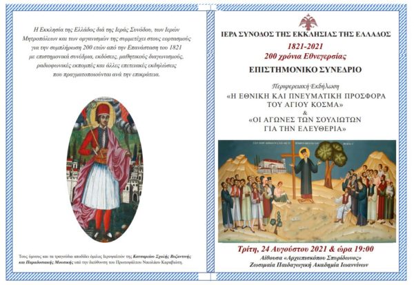 Την Τρίτη 24 Αυγούστου και ώρα 7 μ.μ., η Ιερά Μητρόπολη Ιωαννίνων διοργανώνει στην Αίθουσα «ΑΡΧΙΕΠΙΣΚΟΠΟΥ ΣΠΥΡΙΔΩΝΟΣ» της Ζωσιμαίας Παιδαγωγικής Ακαδημίας Ιωαννίνων, Επιστημονικό Συνέδριο με θέματα την “Εθνική και Πνευματική προσφορά του Αγίου Κοσμά” και τους “Αγώνες των Σουλιωτών για την Ελευθερία”.