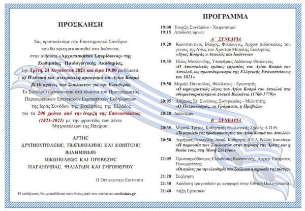 Την Τρίτη 24 Αυγούστου και ώρα 7 μ.μ., η Ιερά Μητρόπολη Ιωαννίνων διοργανώνει στην Αίθουσα «ΑΡΧΙΕΠΙΣΚΟΠΟΥ ΣΠΥΡΙΔΩΝΟΣ» της Ζωσιμαίας Παιδαγωγικής Ακαδημίας Ιωαννίνων, Επιστημονικό Συνέδριο με θέματα την “Εθνική και Πνευματική προσφορά του Αγίου Κοσμά” και τους “Αγώνες των Σουλιωτών για την Ελευθερία”.