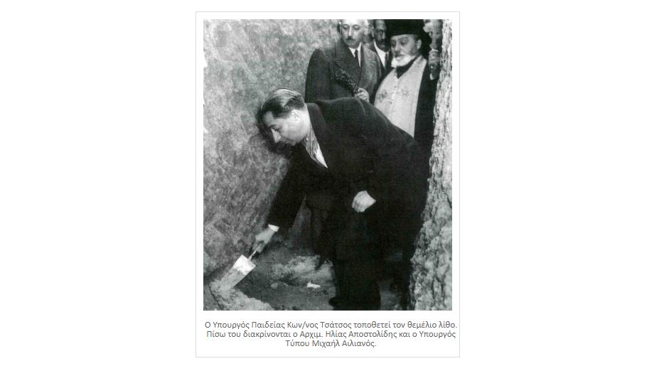 Ο Υπουργός Παιδείας Κων/νος Τσάτσος τοποθετεί τον θεμέλιο λίθο. Πίσω του διακρίνονται ο Αρχιμ. Ηλίας Αποστολίδης και ο Υπουργός Τύπου Μιχαήλ Αιλιανός.