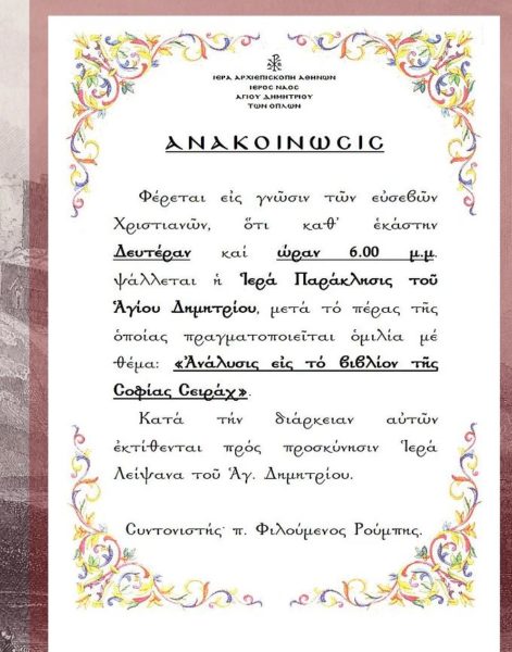 Φέρεται εις γνώσιν των ευσεβούς πληρώματος του Λεκανοπεδίου Αττικής, ότι καθ’ εκάστην Δευτέραν και ώραν 6.00 μ.μ. ψάλλεται Ιερά Παράκλησις του Αγίου Δημητρίου εις τον Ιερόν Ναόν Αγίου Δημητρίου Όπλων, μετά το πέρας της οποίας πραγματοποιείται ομιλία με θέμα “Ανάλυσις εις το βιβλίον της Σοφίας Σειράχ”. Κατά τη διάρκειαν αυτών, εκτίθενται προς προσκύνησιν Ιερά Λείψανα του Αγίου Δημητρίου.