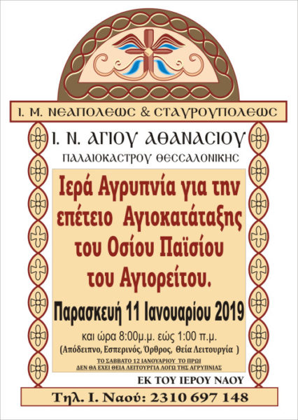 Ιερά αγρυπνία επί της επετείου Αγιοκατάξης του Αγίου Παϊσίου του Αγιορείτου θα εκκινήσει κατά την Παρασκευή 11 Ιανουαρίου και ώρα 8.00 μ.μ. εις τον Ιερόν Ναόν Αγίου Αθανασίου Παλαιοκάστρου Θεσσαλονίκης. Το Σάββατο 12 Ιανουαρίου, το πρωί, δε θα τελεσθεί Θεία Λειτουργία.