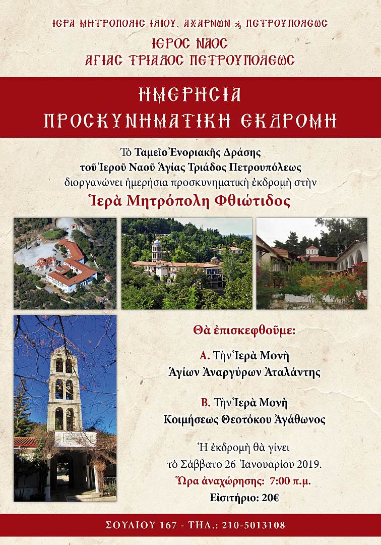 21/01/2019 21/01/2019 Το Ταμείο Ενοριακής Δράσης του Ι.Ν. Αγ. Τριάδος Πετρουπόλεως διοργανώνει ημερήσια προσκυνηματική εκδρομή στην Ιερά Μητρόπολη Φθιώτιδος. Θα επισκεφθεί: Την Ιερά Μονή Αγ. Αναργύρων Αταλάντης Την Ιερά Μονή Κοιμήσεως Θεοτόκου Αγάθωνος Η εκδρομή θα γίνει το Σάββατο 26 Ιανουαρίου 2019, με ώρα αναχώρησης 7 π.μ.