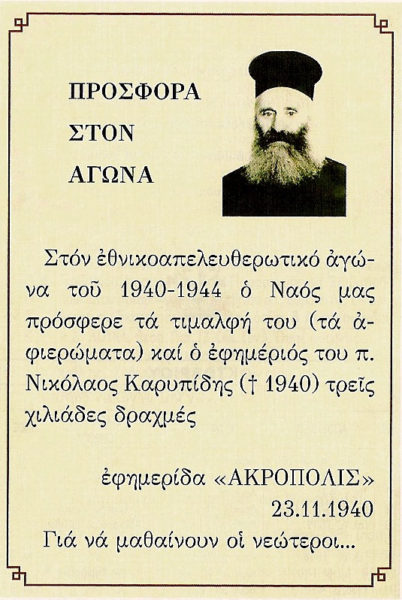 Στον εθνικοαπελευθερωτικό Αγώνα του 1940-44, ο Ιερός Ναός Αγίων Αναργύρων Αττικής πρόσφερε τα τιμάλφη του (αφιερώματα) και ο εφημέριος π. Νικόλαος Καρυπίδης (+1940) τρεις χιλιάδες δραχμές, σύμφωνα με το δημοσίευμα της εφημερίδος “ΑΚΡΟΠΟΛΙΣ” της 23ης Νοεμβρίου 1940.