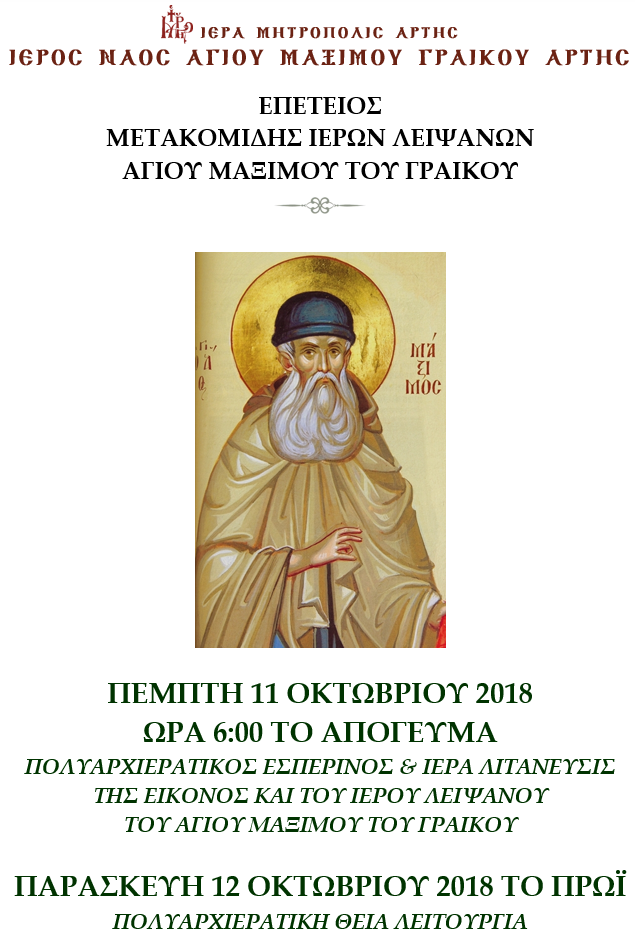 Πολυαρχιερατικός εσπερινός και Ιερά Λιτάνευσις της εικόνος και του Ιερού Λειψάνου του Αγίου Μαξίμου του Γραικού αναμένεται να πραγματοποιηθεί την Πέμπτη 11 Οκτωβρίου στις 6.00 μ.μ. στον ομώνυμο Ιερό Ναό της Άρτας.