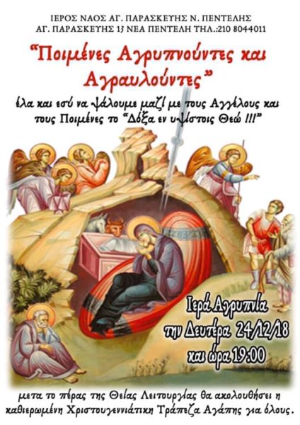 Κατά την εσπέρα της παραμονής των Χριστουγέννων και ώρα 19.00, θα εκκινήσει η Ιερά χριστουγεννιάτικη Αγρυπνία εις τον Ιερό Ναό Αγίας Παρασκευής Νέας Πεντέλης.