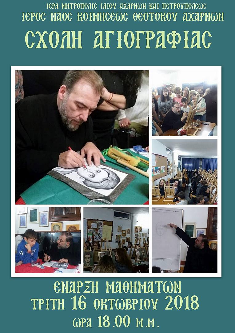 Την Τρίτη 16 Οκτωβρίου 2018 και ώρα 18.00 αρχίζουν τα Μαθήματα της σχολής Αγιογραφίας στον Ιερό Ναό Κοιμήσεως Θεοτόκου Αχαρνών, όπως ενημερώνει με ανακοίνωσή της η Ιερά Μητρόπολη Ιλίου, Αχαρνών και Πετρουπόλεως.