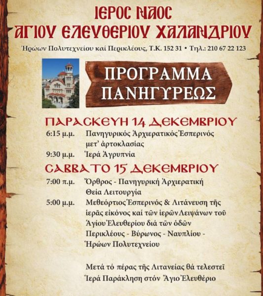 Όπως και κάθε χρόνο, έτσι και φέτος με πάρα πολύ κρύο, θα πανηγυρίσει ο Άγιος Ελευθέριος Χαλανδρίου. Ο πανηγυρικός Εσπερινός της 14ης Δεκεμβρίου 2018, ώρα 6.15 μ.μ., θα σημάνει την εκκίνηση του εορταστικού διημέρου. Κατά την εσπέρα της παραμονής, θα ξεκινήσει Ιερά Αγρυπνία στις 9.30 μ.μ.
