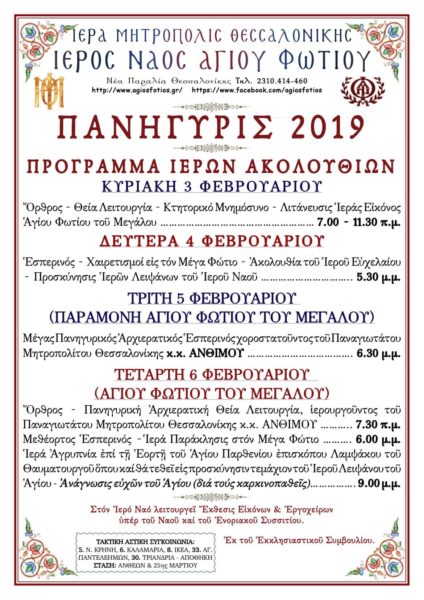 Πανηγυρίζει, εντός ολίγων ημερών, ο Ιερός Ναός Αγίου Φωτίου του Μεγάλου Θεσσαλονίκης σύμφωνα με το κάτωθι Πρόγραμμα Ιερών Ακολουθιών: