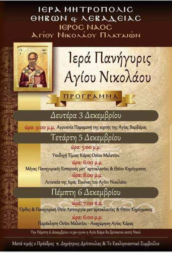 Την μνήμη του Αγίου Νικολάου θα πανηγυρίσει ο Ιερός Ναός Αγίου Νικολάου Πλαταιών. Κατά την διάρκεια των εορτασμών θα τεθεί προς προσκύνηση η Τίμια Κάρα του Οσίου Μελετίου.