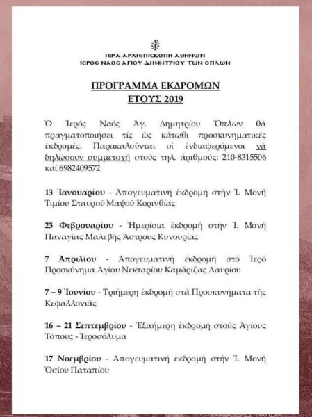 Ο Ιερός Ναός Αγίου Δημητρίου Όπλων θα πραγματοποιήσει μία σειρά από εκδρομές εντός του νεοεισερχομένου Νέου Έτους 2019, με πρώτη εξόρμηση στις 13 Ιανουαρίου, οπότε θα λάβει χώρα απογευματινή εκδρομή εις την Ιερά Μονή Τιμίου Σταυρού Μαψού Κορινθίας.