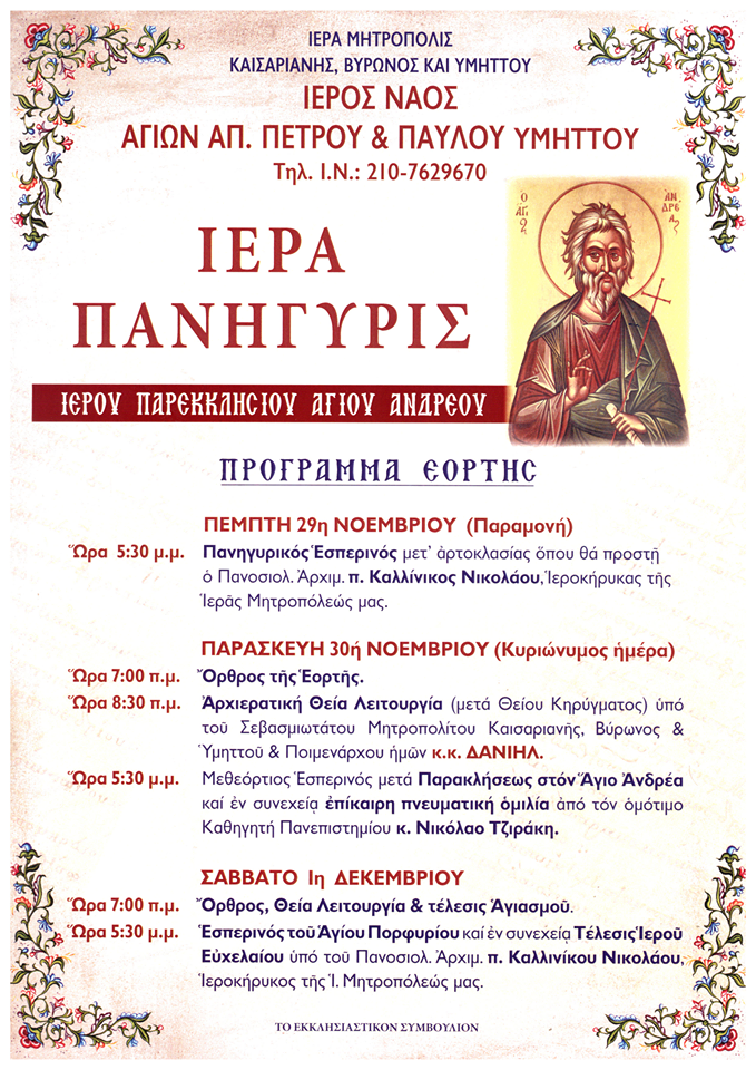 Το Ιερό παρεκκλήσιο της ενορίας των Αγίων Πέτρου και Παύλου Υμηττού που είναι αφιερωμένο στον Άγιο Ανδρέα το διήμερο 29 – 30 Νοεμβρίου θα πανηγυρίσει την μνήμη του Αγίου Ανδρέα. Αναλυτικά το πρόγραμμα: