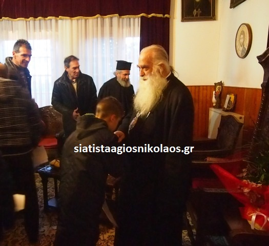 Ο Σεβασμιώτατος, αφού τους υποδέχθηκε και άκουσε τα κάλαντα, τους ύμνους και τις ευχές όλων, στη συνέχεια τους ευχαρίστησε και τους ευχήθηκε «Καλά και ευλογημένα Χριστούγεννα», δίνοντάς τους από μία εικόνα τις Γεννήσεως του Ιησού Χριστού στον καθένα.