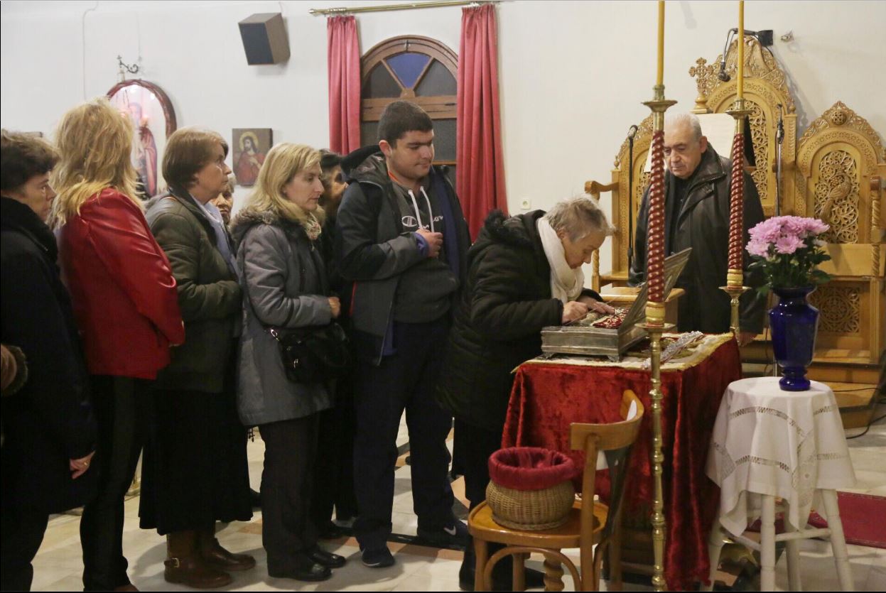 Το λείψανο εκόμησε στον Ιερό Ναό ο Ιερομόναχος της Μονής π. Φιλόθεος Κουτλουμουσιανός. Το Ιερό κειμήλιο υποδέχτηκαν οι εφημέριοι του Ιερού Ναού π. Βασίλειος Λιβανίδης , π. Γρηγόριος Σταμκόπουλος και π. Αθανάσιος Κουτρούπης.
