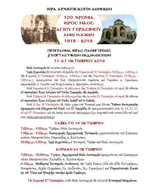 100 ΧΡΟΝΙΑ ΙΕΡΟΥ ΝΑΟΥ ΑΓΙΟΥ ΓΕΡΑΣΙΜΟΥ ΙΛΙΣΙΩΝ – 11-21 Οκτωβρίου 2019 – Ὁ ἑορτασμὸς περιλαμβάνει λατρευτικές συνάξεις, Θεῖες Λειτουργίες, ἀγρυπνίες, παρακλήσεις, τὴν προσκύνησιν τῶν Ἱερῶν Λειψάνων τοῦ ὁσίου Σεραφείμ Δομβοῦς (11 ἔως 16/10/2019) καὶ τοῦ ὁσίου Δαβίδ τοῦ ἐν Εὐβοίᾳ (16 ἔως 21/10/2019) καὶ ἀναφορὲς στὴν Ἱστορία καὶ στὶς δραστηριότητες τῆς ἐνορίας καὶ τὶς ἑξῆς ἡμερίδες: