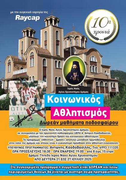 Ο Ιερός Ναός Αγίου Χρυσοστόμου Δράμας σε συνεργασία με τον προπονητή ποδοσφαίρου UEFA Α Αντώνη Κασδοβασίλη, υλοποιεί την καινοτόμο δράση του 10ου κοινωνικού αθλητισμού από 21 έως 27 Ιουλίου.