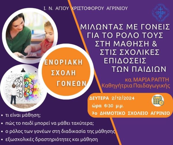 Τη Δευτέρα 2 Δεκεμβρίου 2024 και ώρα 6:30 το απόγευμα στην αίθουσα εκδηλώσεων του 7ου Δημοτικού Σχολείου Αγρινίου θα πραγματοποιηθεί η τρίτη συνάντηση της Ενοριακής σχολής Γονέων και Νέων Ζευγαριών του Ι. Ν. Αγίου Χριστοφόρου Αγρινίου με ομιλήτρια την καθηγήτρια Παιδαγωγικής κ. Μαρία Ράπτη και θέμα: «Μιλώντας με γονείς για το ρόλο τους στη μάθηση και στις σχολικές επιδόσεις των παιδιών».