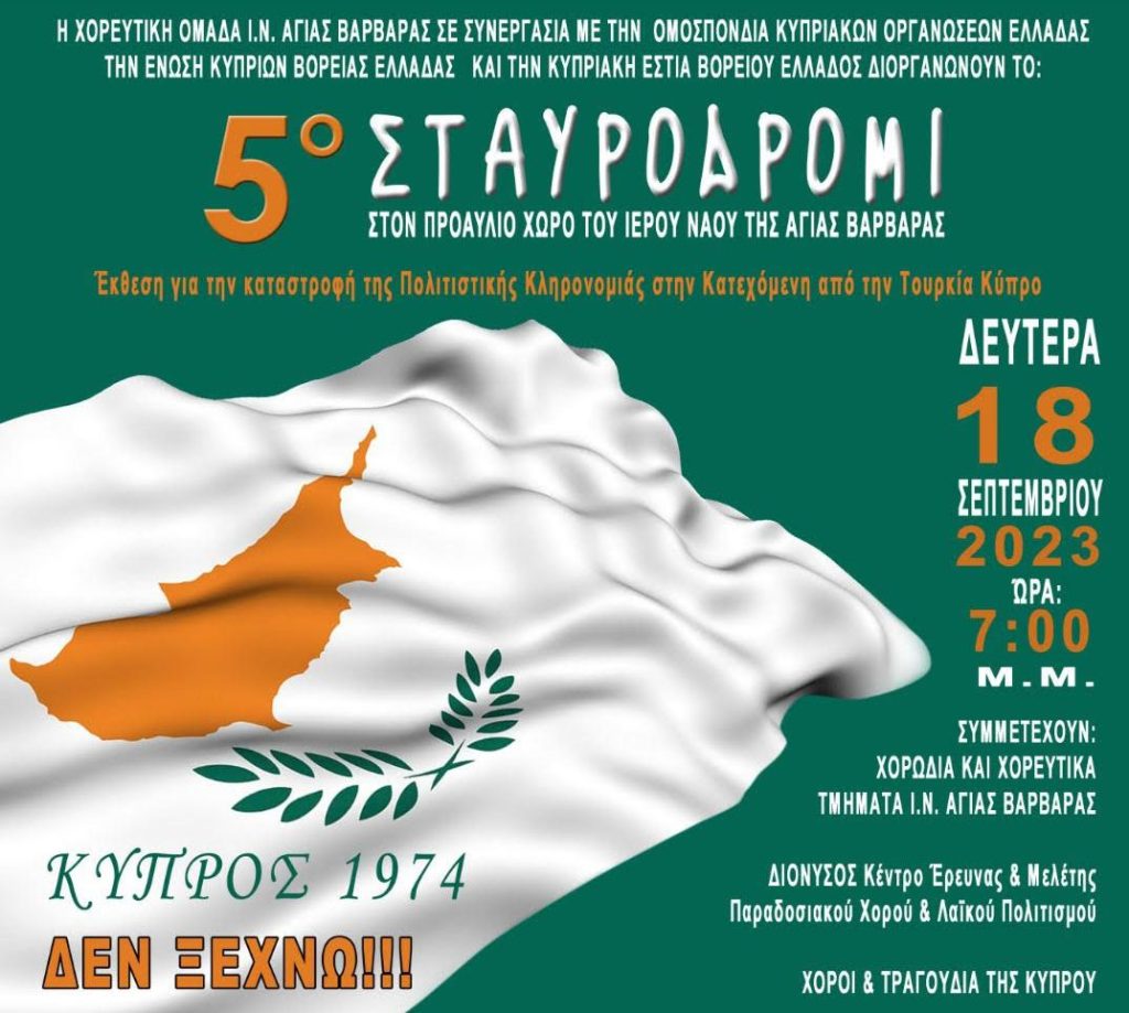Η Χορευτική ομάδα Ι.Ν. Αγίας Βαρβάρας σε συνεργασία με την Ομοσπονδία Κυπριακών οργανώσεων Ελλάδας και την Ένωση Κυπρίων Βόρειας Ελλάδας και την Κυπριακή Εστία Βόρειας Ελλάδας διοργανώνουν το 5ο Σταυροδρόμι στον προαύλιο χώρος του Ιερού Ναού της Αγίας Βαρβάρας Θεσσαλονίκης την Δευτέρα 18 Σεπτεμβρίου 2023 στις 19:00