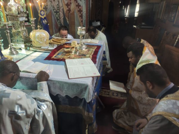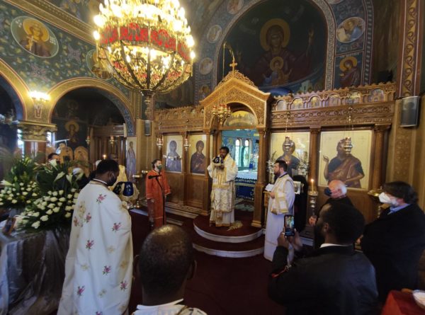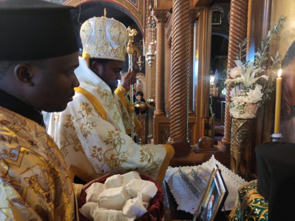 Την Θεία Λειτουργία τέλεσε ο πρόσφατα εκλεγείς και χειροτονηθείς μητροπολίτης Κανάγκας Χαρίτων, συμπαραστατούμενος από τους αφρικανούς κληρικούς, αρχιμανδρίτη Αθανάσιο, πρωτοπρεσβύτερο Σαμουήλ και διάκονο Στέφανο καθώς και τους εκ των κληρικών του ναού, αρχιμανδρίτη Σεραφείμ Δημητρίου και διάκονο Γεώργιο Βάρσο, ενώ συμπροσευχόμενος παρέστη και έλαβε μέρος στο ιερό μνημόσυνο, ο αρχιμανδρίτης Σέργιος Βαρέλιας.