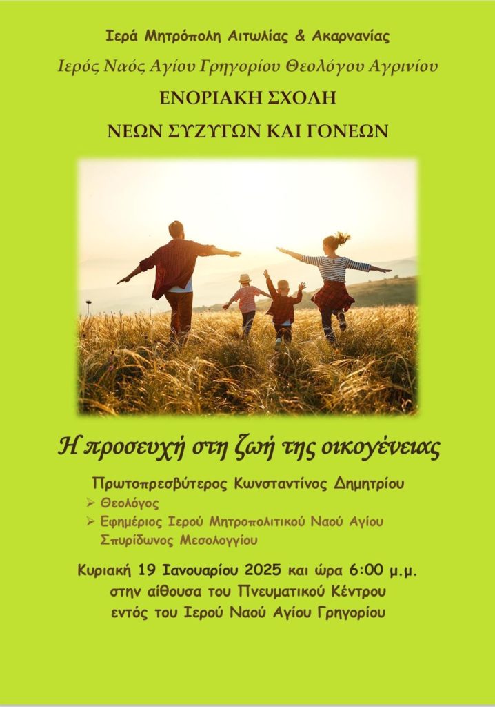 Την Κυριακή 19 Ιανουαρίου 2025 και ώρα 6:00 μ.μ. θα πραγματοποιηθεί η τρίτη κατά σειρά συνάντηση της Σχολής Νέων Συζύγων και Γονέων στην αίθουσα του Πνευματικού Κέντρου εντός του Ιερού Ναού Αγίου Γρηγορίου Θεολόγου Αγρινίου.