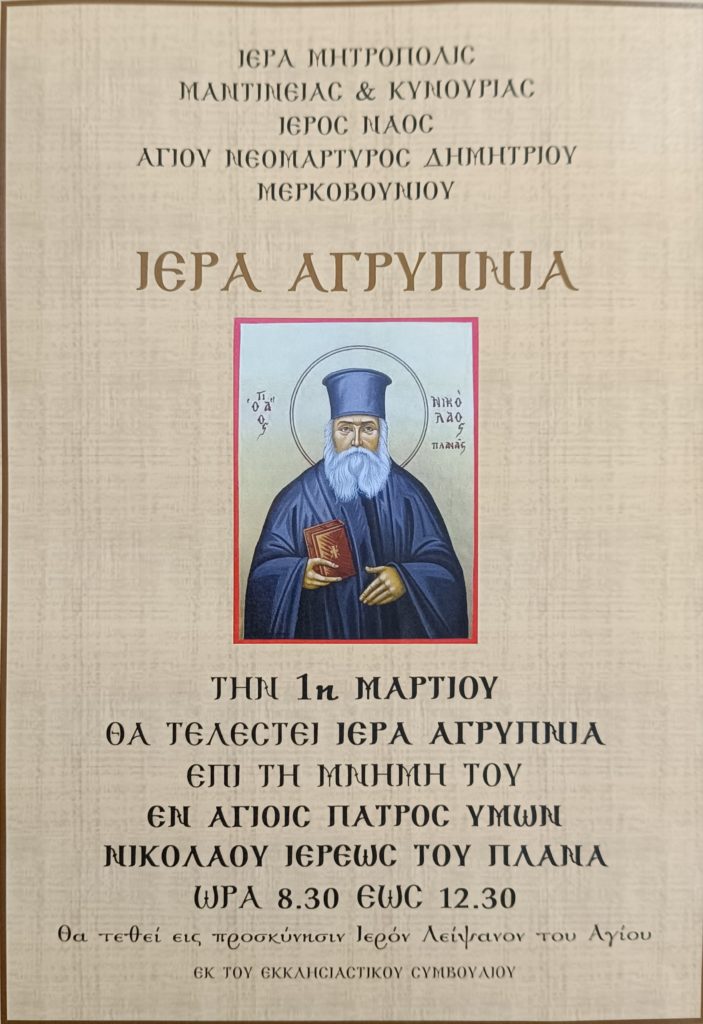 Αγρυπνία εορτής Αγίου Νικολάου του Πλανά στον Ι.Ν. Αγίου Νεομάρτυρος Δημητρίου Μερκοβουνίου Αρκαδίας