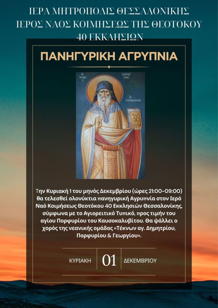 23/11/2024 24/11/2024 Την Κυριακή 1η Δεκεμβρίου 2024 (ώρες 21:00-09:00) θα τελεσθεί ολονύκτια πανηγυρική Αγρυπνία στον Ιερό Ναό Κοιμήσεως Θεοτόκου 40 Εκκλησιών Θεσσαλονίκης, σύμφωνα με το Αγιορειτικό Τυπικό, προς τιμήν του Αγίου Πορφυρίου του Καυσοκαλυβίτου. Θα ψάλλει ο χορός της νεανικής ομάδας «Τέκνων Αγ. Δημητρίου, Πορφυρίου & Γεωργίου».