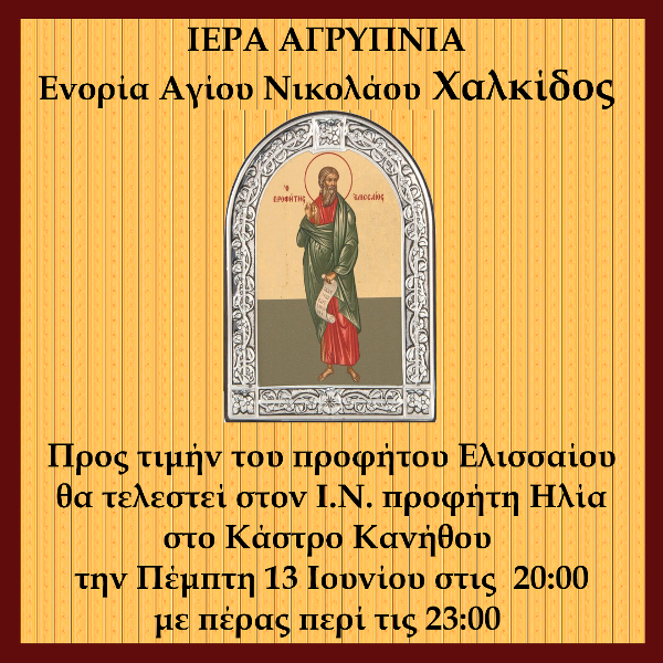 Ιερά Αγρυπνία προς τιμήν του Προφήτου Ελισσαίου θα λάβει χώρα εις τον Ι.Ν. Προφήτου Ηλιού στο Κάστρο Κανήθου, κατά την Πέμπτη 13 Ιουνίου 2019 στις 20.00 με πέρας περί της 23.00.