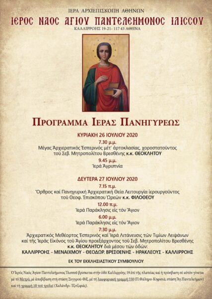 Της Πανηγυρικής Αρχιερατικής Θείας Λειτουργίας θα προεξάρχει από τις 7.15 π.μ. ο Σεβασμιώτατος Μητροπολίτης Ωρεών κ. Φιλόθεος, ενώ στις 12 μ.μ. θα ψαλλεί παράκληση στον Άγιο. Το ίδιο θα γίνει και στις 6 το απόγευμα, ενώ στις 7.30 θα αρχίσει ο μεθεόρτιος Εσπερινός, μετά το πέρας του οποίου θα γίνει Ιερά Λιτάνευσις των τιμίων λειψάνων και της Ιεράς εικόνος του Αγίου, προεξάρχοντος του Σεβ. Μητροπολίτου Βρεσθένης κ. Θεοκλήτου.