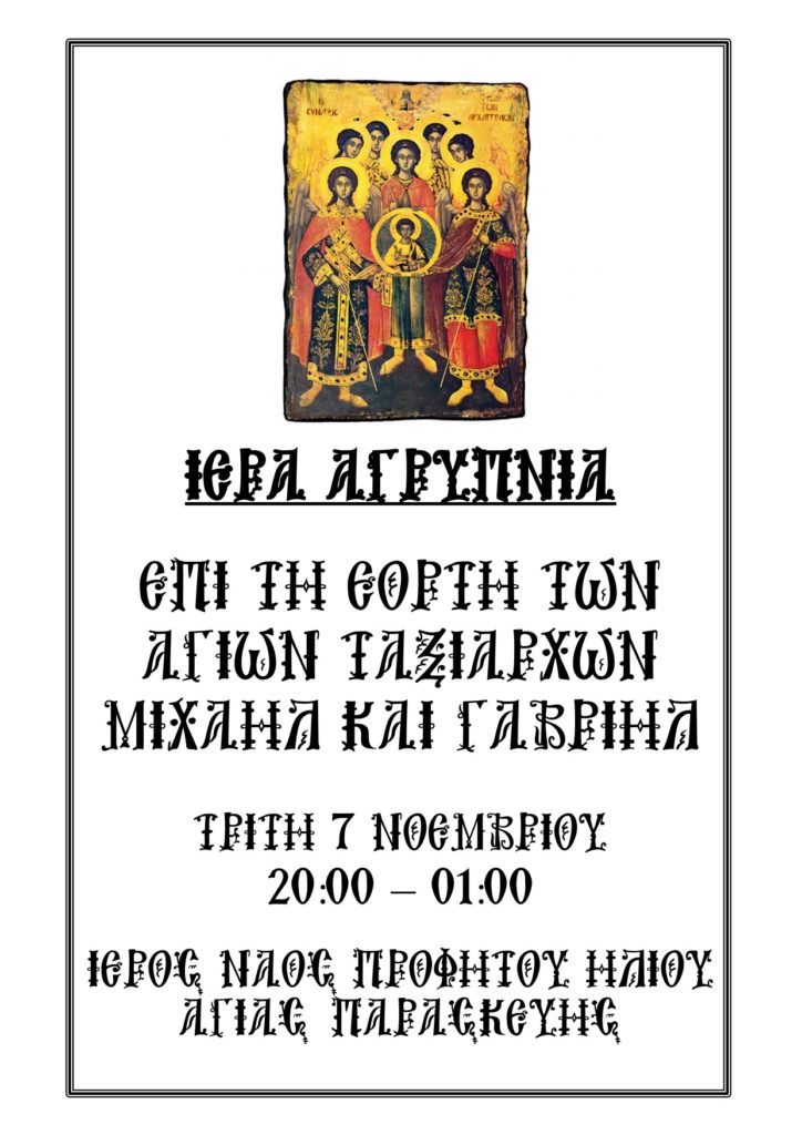Ιερά Αγρυπνία πραγματοποιεί ο Ιερός Ναός Προφήτου Ηλιού του Δήμου Αγίας Παρασκευής, την Τρίτη 7η Νοεμβρίου 2023 από τις 20:00 έως τη 1:00πμ, επί τη εορτή των Αγίων Ταξιαρχών Μιχαήλ και Γαβριήλ.