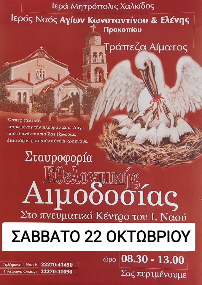 Αιμοδοσία αγάπης θα πραγματοποιηθεί στην αίθουσα του Πνευματικού κέντρου, του Ιερού Ναού Αγίου Κωνσταντίνου και Ελένη Προκοπίου Εύβοιας, το Σάββατο 22 Οκτωβρίου.