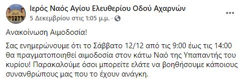 Αιμοδοσία για να καλυφθούν οι αυξημένες ανάγκες που υπάρχουν σε αίμα, διοργανώνει ο Ιερός Ναός του Αγίου Ελευθερίου Αχαρνών. Όπως αναφέρεται σε ανάρτηση στα μέσα κοινωνικής δικτύωσης, η αιμοδοσία θα πραγματοποιηθεί το ερχόμενο Σάββατο 12/12 από τις 9:00 έως τις 14:00 στον κάτω Ναό της Υπαπαντής του κυρίου