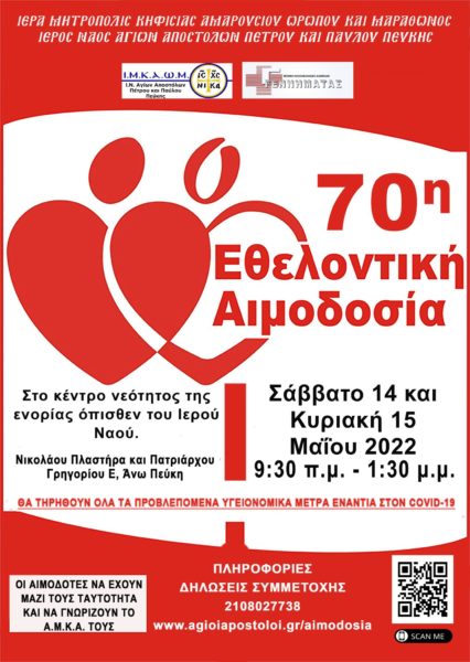 Προσκλητήριο για την κάλυψη αναγκών για αίμα απευθύνει η ενορία των Αγίων Πέτρου και Παύλου Πεύκης, η οποία το Σάββατο 14 και την Κυριακή 15 Μαΐου 2022, θα πραγματοποιεί την 70η αιμοδοσία της στο πνευματικό κέντρο της ενορίας και ώρες 9:30 έως 13:30.