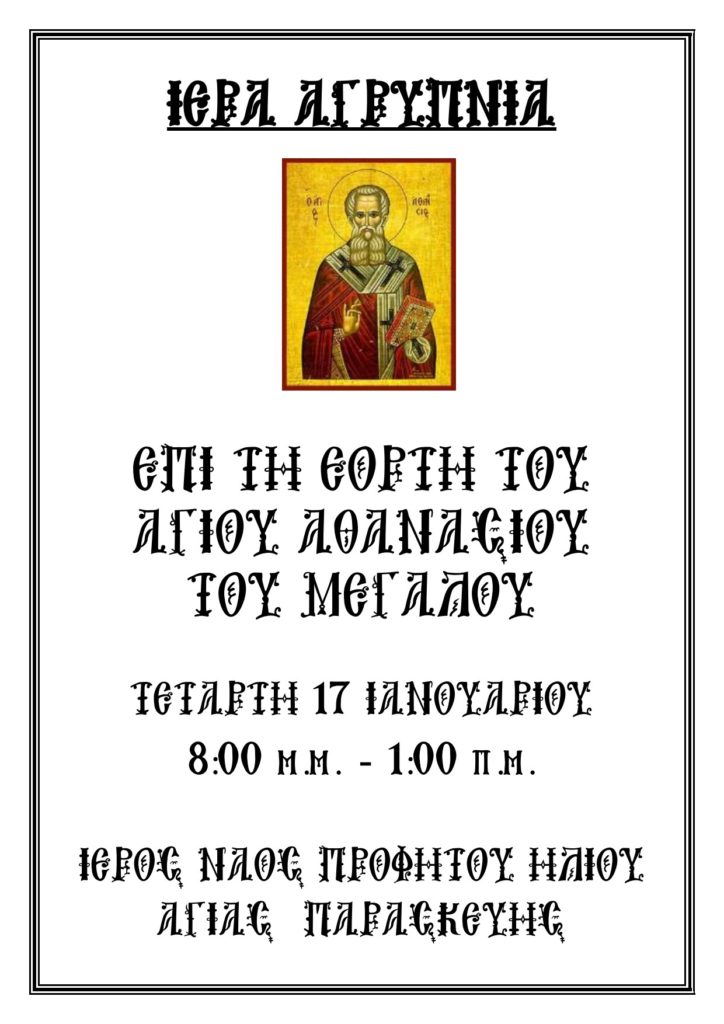 Ενορίες 11 Ιανουαρίου, 2024 Ανακοίνωση αγρυπνίας εορτής Αγίου Αθανασίου στον Ι.Ν. Προφήτου Ηλιού Δήμου Αγίας Παρασκευής Διαδώστε: Ιερά Αγρυπνία για την εορτή του Αγίου Αθανασίου του Μεγάλου θα τελεστεί στον Ιερό Ναό Προφήτου Ηλιού του Δήμου Αγίας Παρασκευής την Τετάρτη 17 Ιανουαρίου 2024 και ώρα 8:00 μ.μ. – 1:00 π.μ. Διαδώστε: