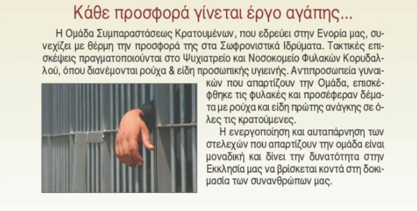 Η Ομάδα Συμπαραστάσεως Κρατουμένων, η οποία εδρεύει στην Ενορία Ιερού Ναού Ευαγγελίστριας Πειραιώς, πραγματοποιεί τακτικές επισκέψεις σε σωφρονιστικά ιδρύματα και ιδιαιτέρως στο Ψυχιατρείο και Νοσοκομείο Φυλακών Κορυδαλλού, όπου διανέμονται ρούχα και είδη προσωπικής υγιεινής. Αντιπροσωπεία γυναικών που απαρτίζουν την ομάδα, επισκέφθηκε τις φυλακές και προσέφερε δέματα με ρούχα και είδη πρώτης ανάγκης σε όλες τις κρατούμενες, όπως μάς ενημερώνει η “Νέα Ενοριακή” (27 Ιανουαρίου – 3 Φεβρουαρίου 2019).